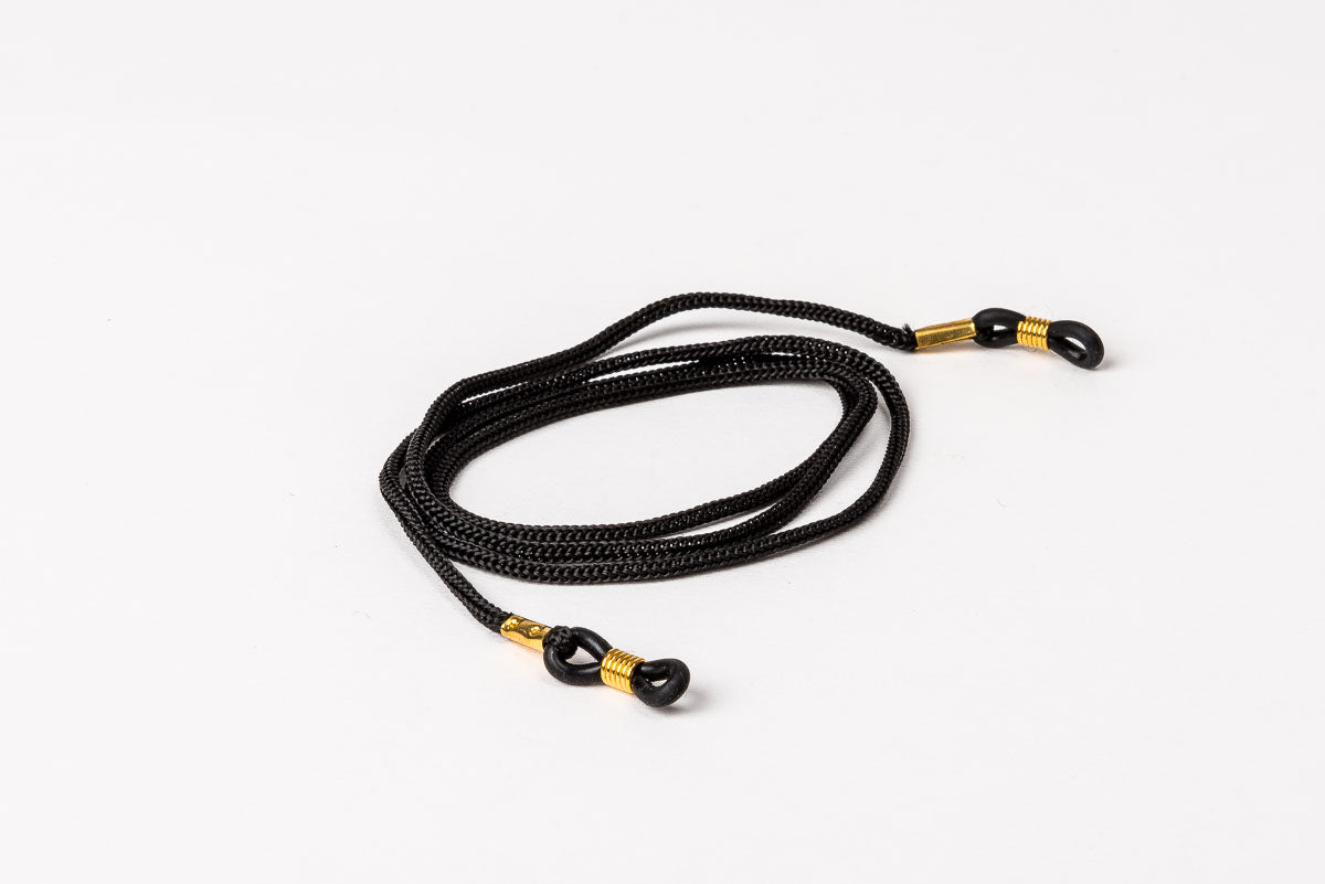 Glasögonsnöre i svart textil för att hänga glasögon, solglasögon eller läsglasögon runt halsen.