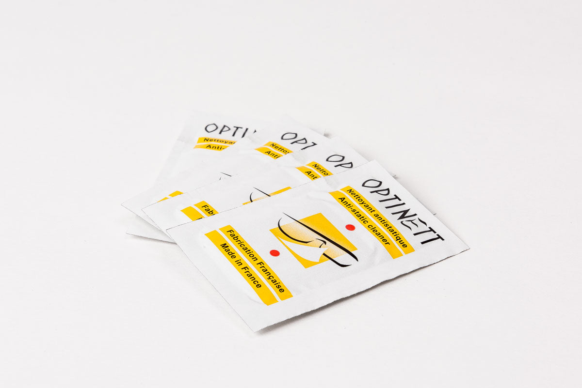 Våtservetterna är enkla att ha med sig & fungerar ihop med alla typer av glas, även på smartphones. De rengör säkert och lämnar en varaktig klar, skinande yta utan att lämna några rester eller feta hinnor. Optinett bidrar även med en antistatisk hinna som hindrar glasögonen från att bli smutsiga igen.